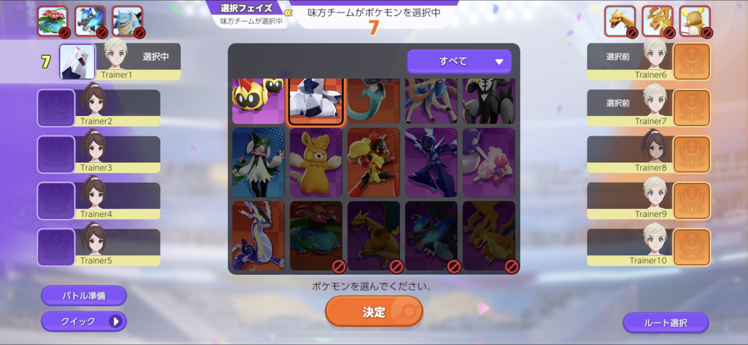 自動禁止機能: 試合に登場した10匹のポケモンは、以降の試合の「使用禁止投票」と「選択」の両フェーズで、両チーム共に選択できなくなります。
