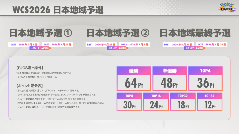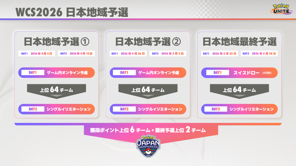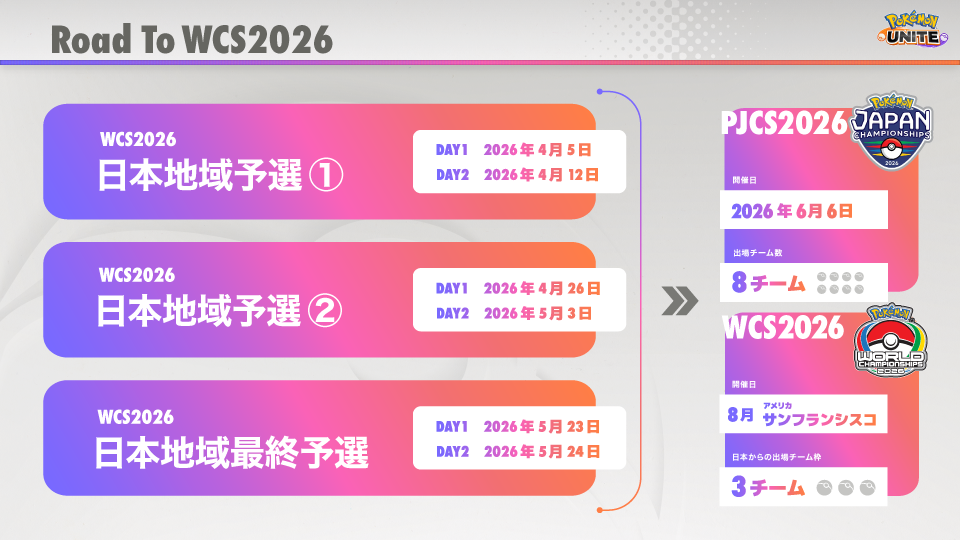 日本地域予選を勝ち抜いた8チームがPJCSに出場し、上位3チームにポケモンWCS2026への出場権が与えられます。
